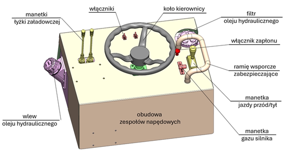 – Opracowaliśmy konstrukcję pojazdu napędzanego hydraulicznie z silnikiem spalinowym, ale równie dobrze może być napędzana silnikiem elektrycznym czy hybrydowym – wymienia prof. Szusta. – Układ hydrauliczny został przewymiarowany, tak żeby można było dokładać do tego obiektu kolejne odbiorniki ciśnienia hydraulicznego.