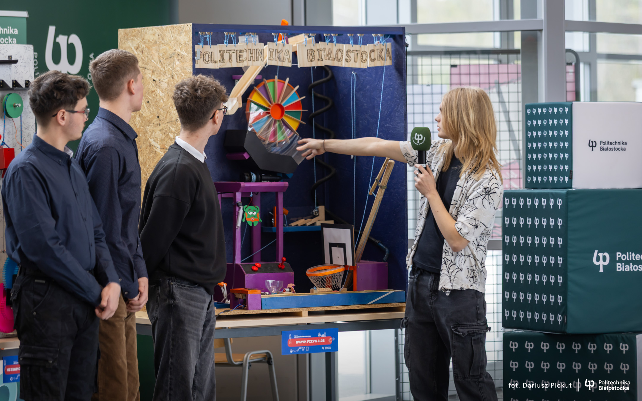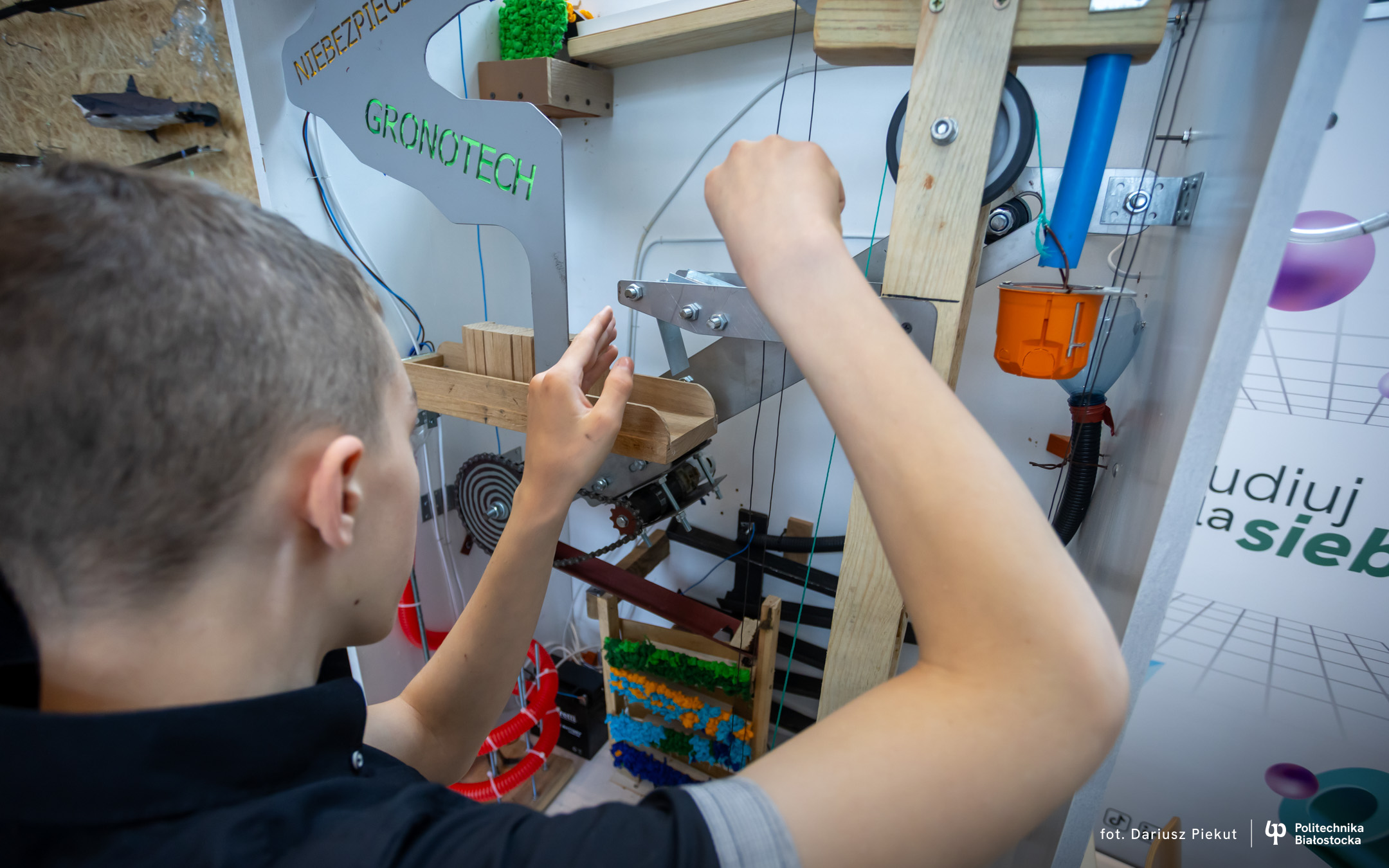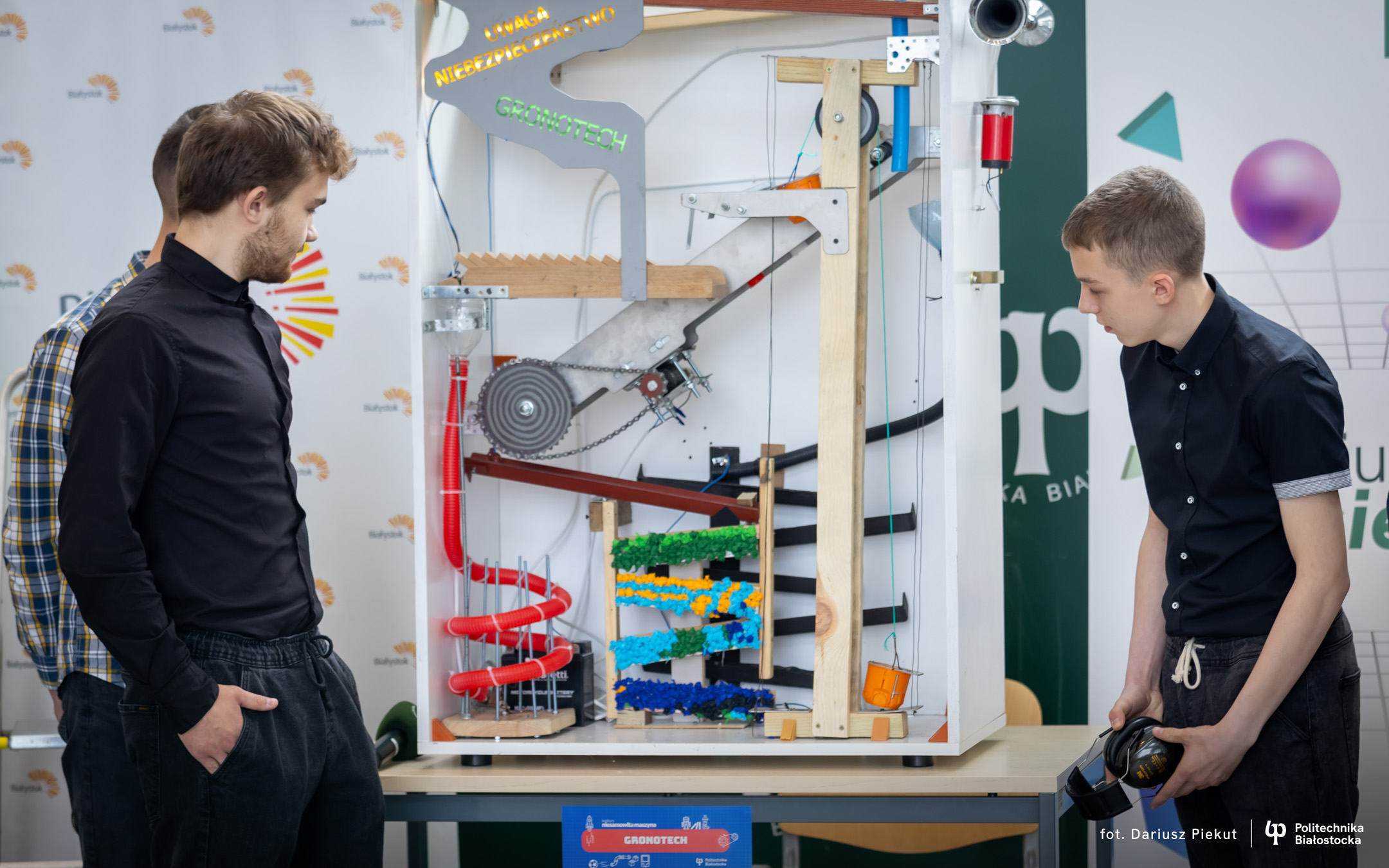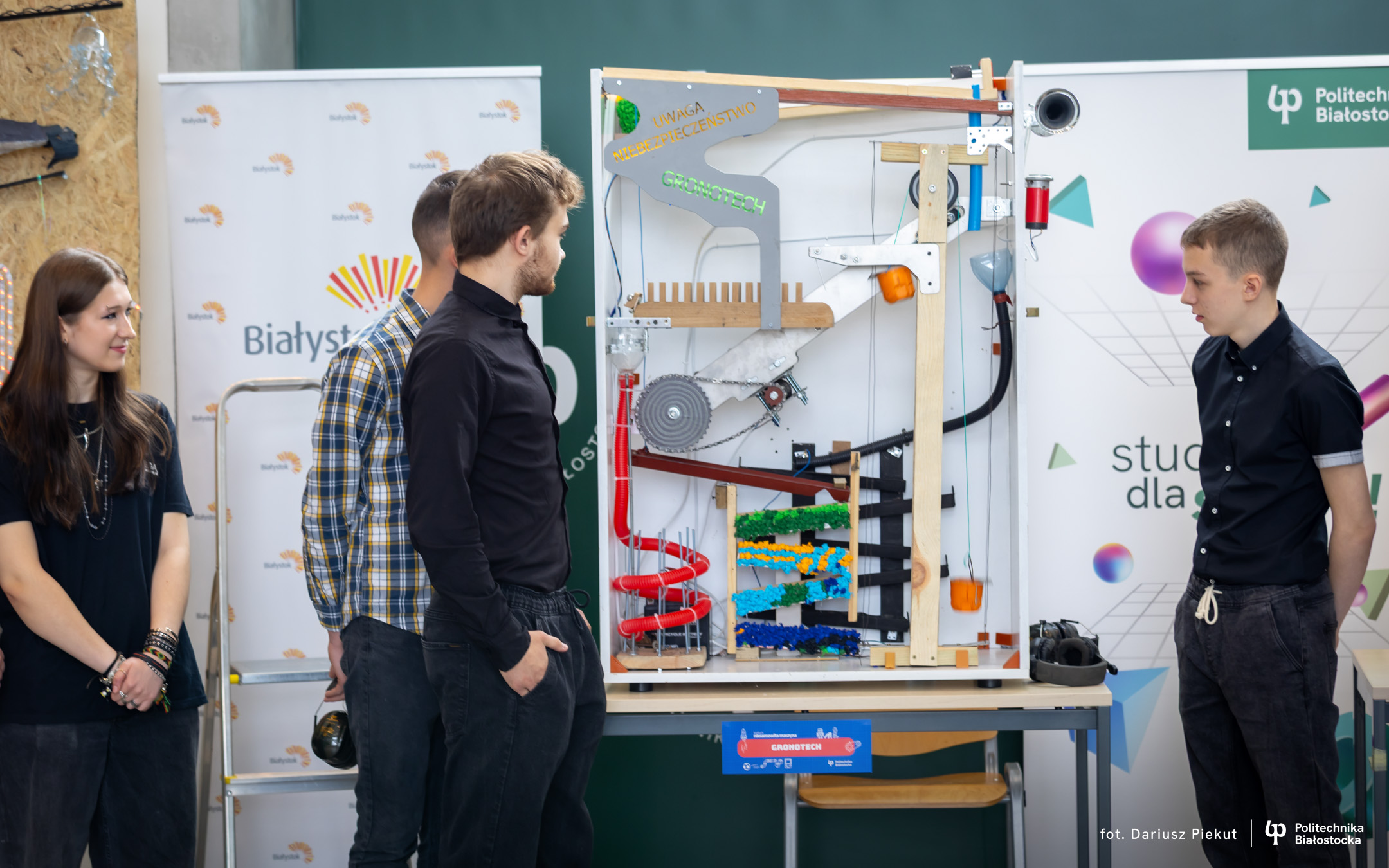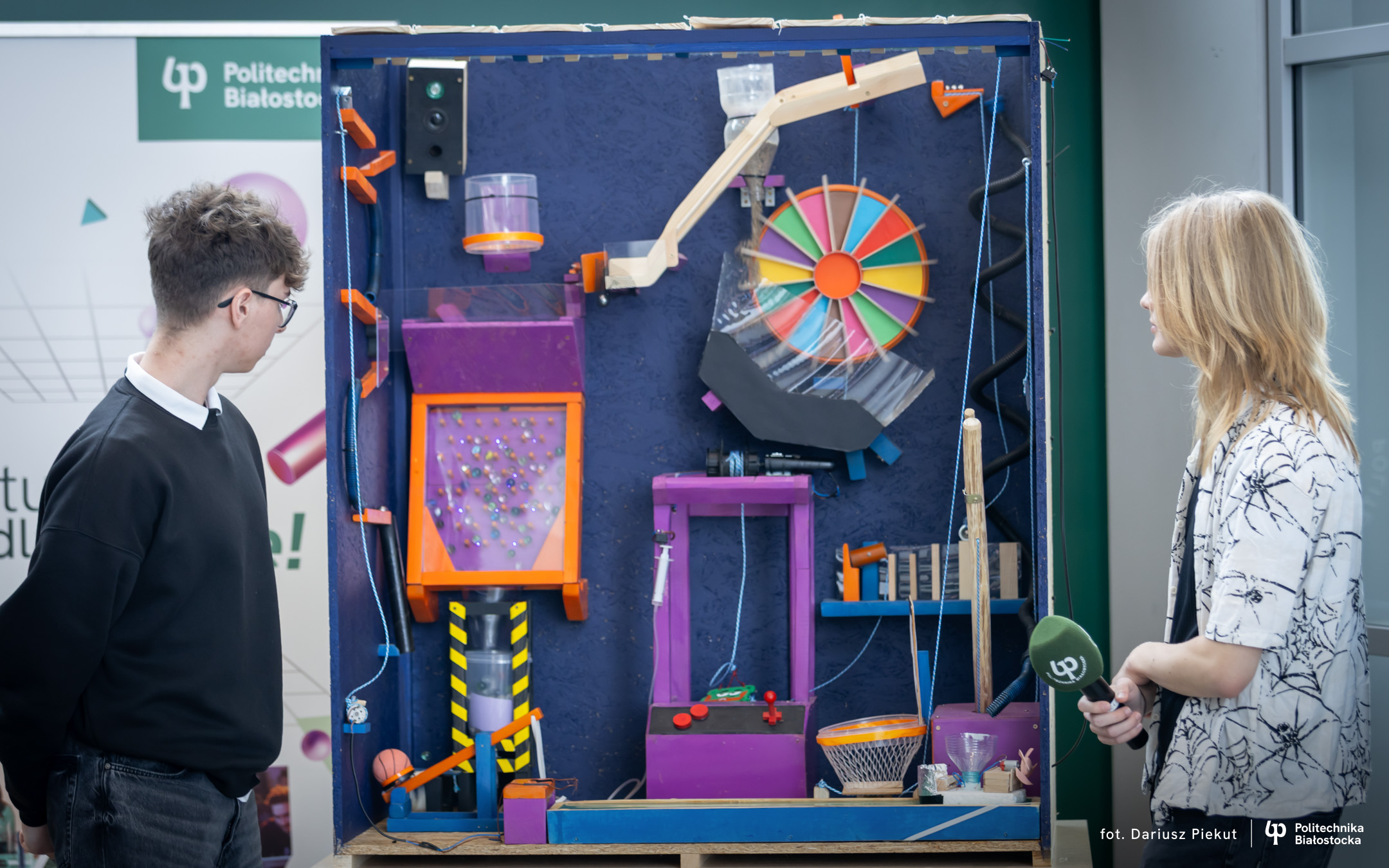 „Niesamowita maszyna” to konkurs o indeks, który po raz ósmy organizuje Politechnika Białostocka dla uczniów szkół ponadpodstawowych, w szczególności maturzystów. Aby wziąć w nim udział należy stworzyć urządzenie na wzór maszyny Rube’a Goldberga, w którym połączone ze sobą mechanizmy, działające na zasadzie domina, doprowadzają do końcowego, efektownego finału.