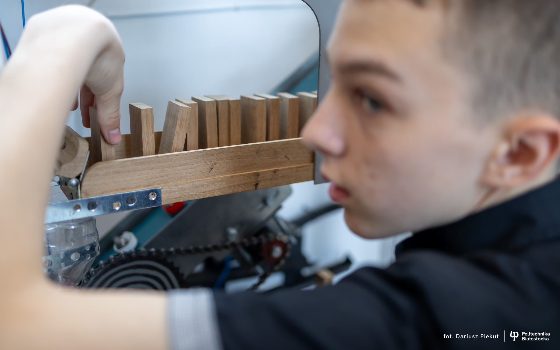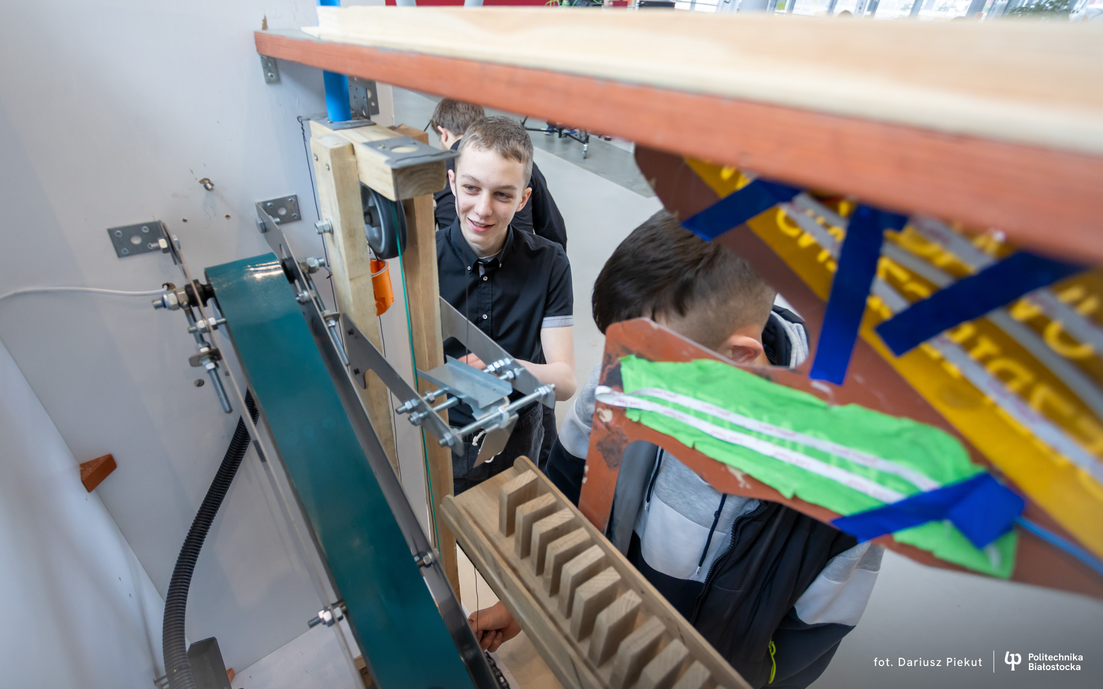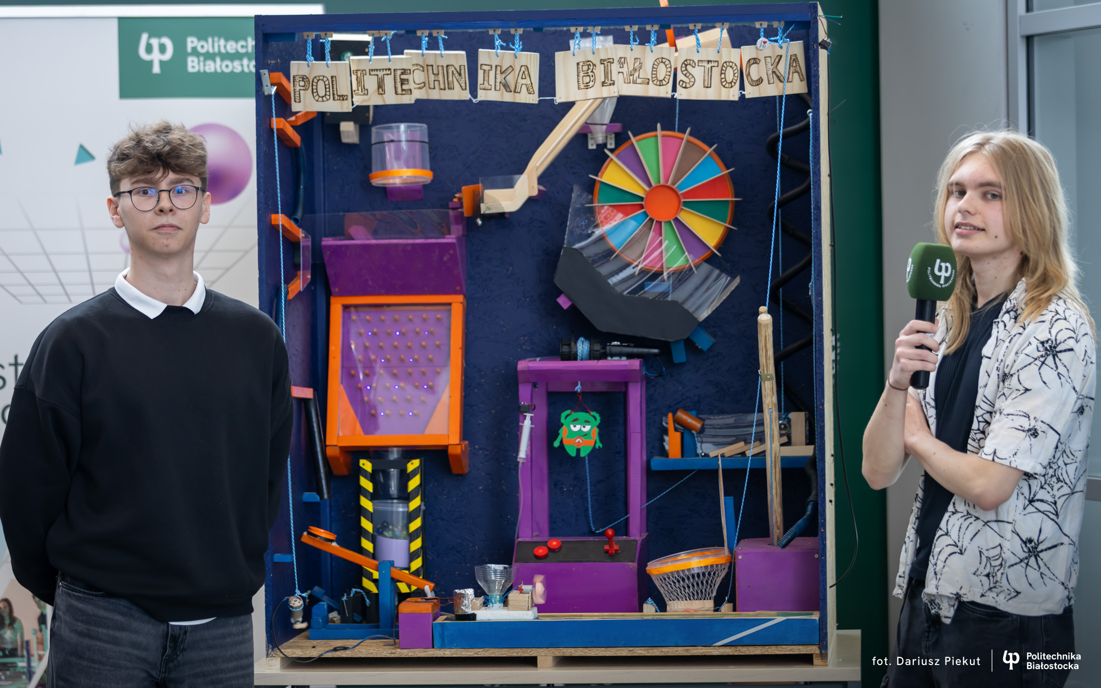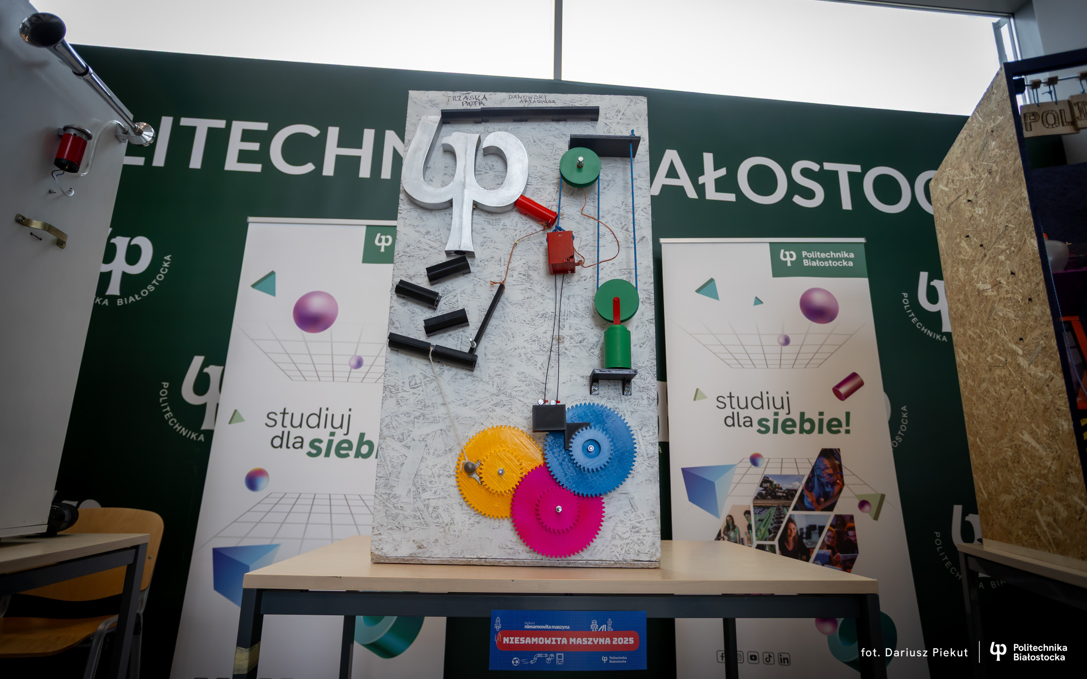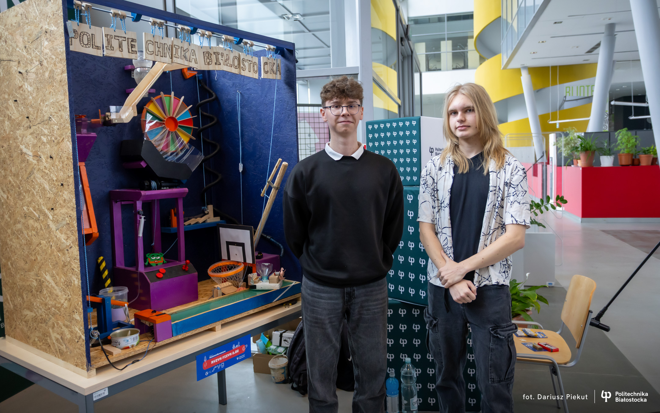 „Niesamowita maszyna” to konkurs o indeks, który po raz ósmy organizuje Politechnika Białostocka dla uczniów szkół ponadpodstawowych, w szczególności maturzystów. Aby wziąć w nim udział należy stworzyć urządzenie na wzór maszyny Rube’a Goldberga, w którym połączone ze sobą mechanizmy, działające na zasadzie domina, doprowadzają do końcowego, efektownego finału.